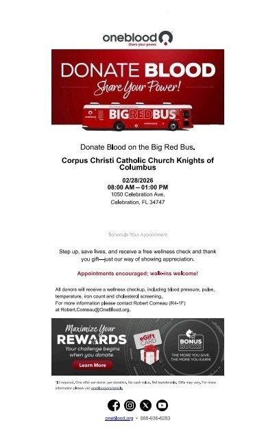 Please mark your calendar for the next Corpus Christi Blood Drive which will be held on Saturday, February 28, 2026.